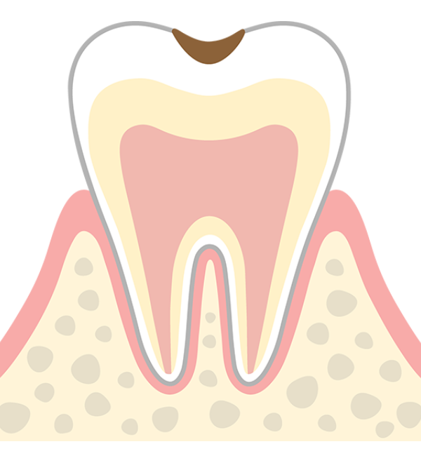 歯の表面のエナメル質がさらに溶け、黒ずんでいる状態。冷たいものがしみることがありますが、まだ痛みは感じません。
