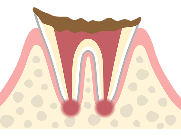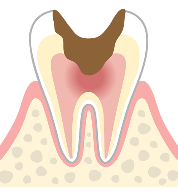 神経まで虫歯が進行した状態。熱いものがしみるようになるほか、何もしなくてもズキズキ激しく痛むようになります。
